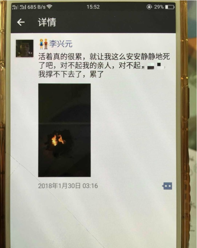 李兴元最后一条朋友圈是1月30日凌晨3:16,“活着真的很累,就让我这么安安静静地死了吧,对不起我的家人,我撑不下去了,累了。”并配了一张碳在燃烧的图。