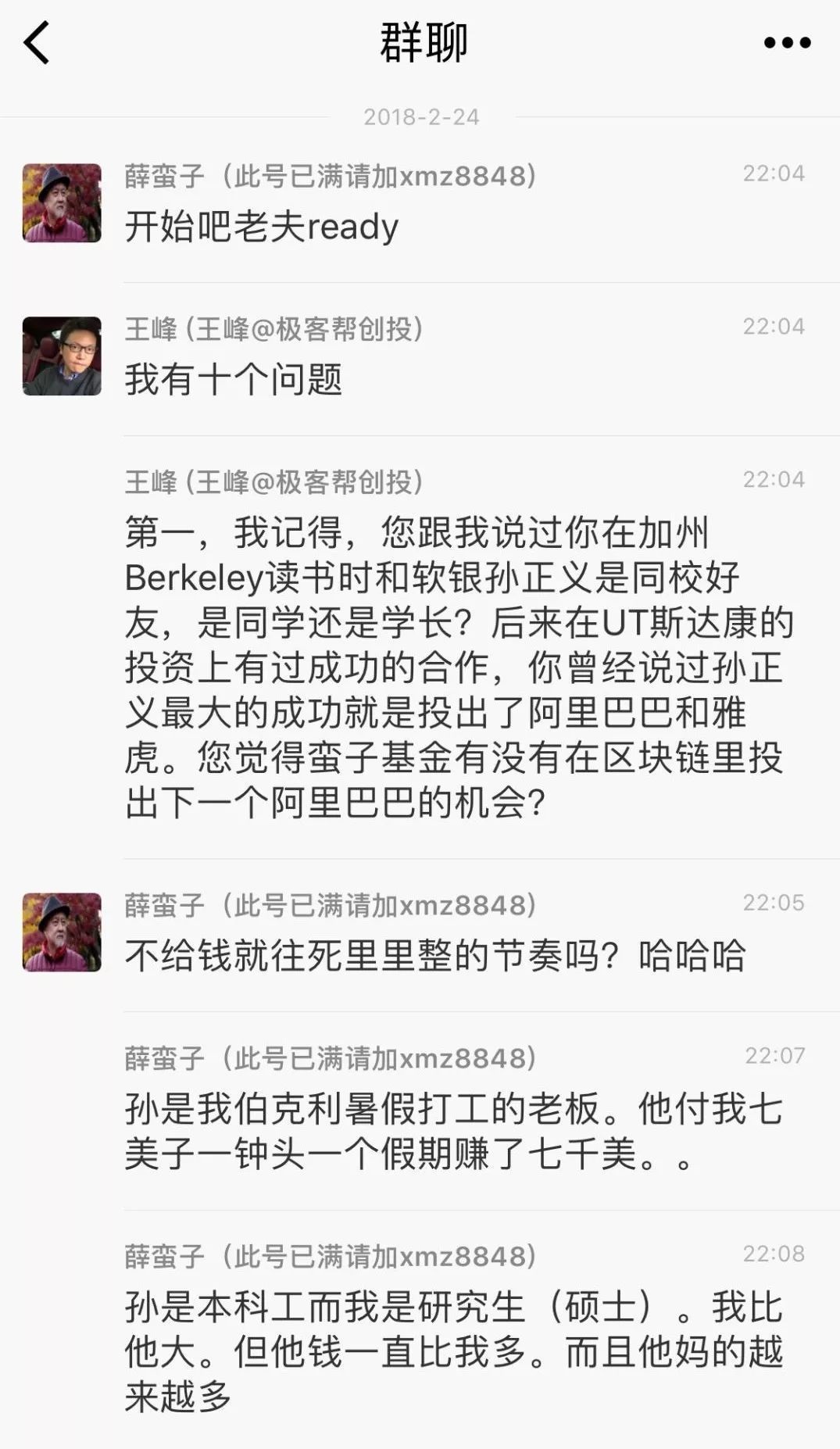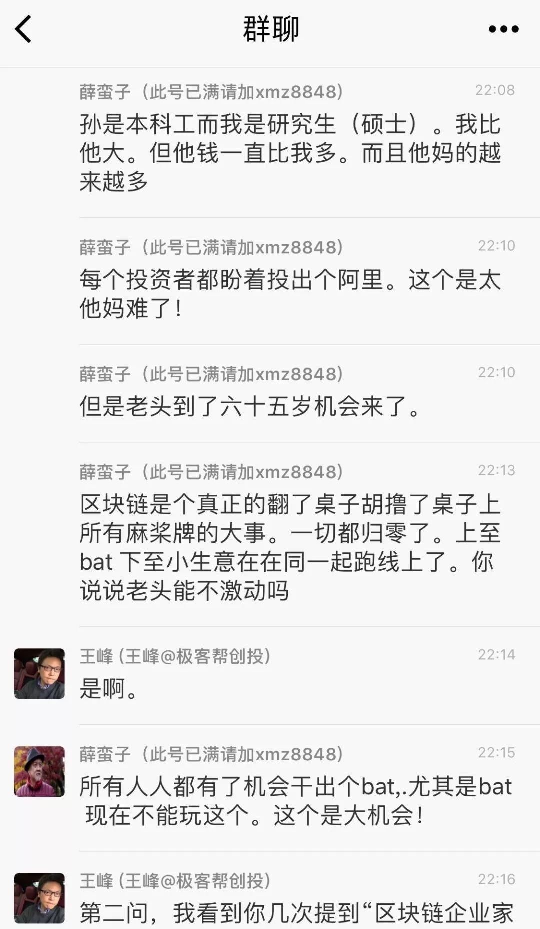 3点钟无眠群的模式也被其复制,成立了3点钟火星财经学习成长群。在该群最近一次分享中,王峰连续向薛蛮子问了十个问题。当被问及蛮子基金有没有机会在区块链中投出下一个阿里巴巴时,薛蛮子答道,区块链是真正翻了桌子、胡撸了桌子上所有麻将牌的大事。“老头到了六十五岁机会来了”,“一切都归零了,上至BAT下至小生意都在同一起跑线上,你说说老头能不激动吗?”