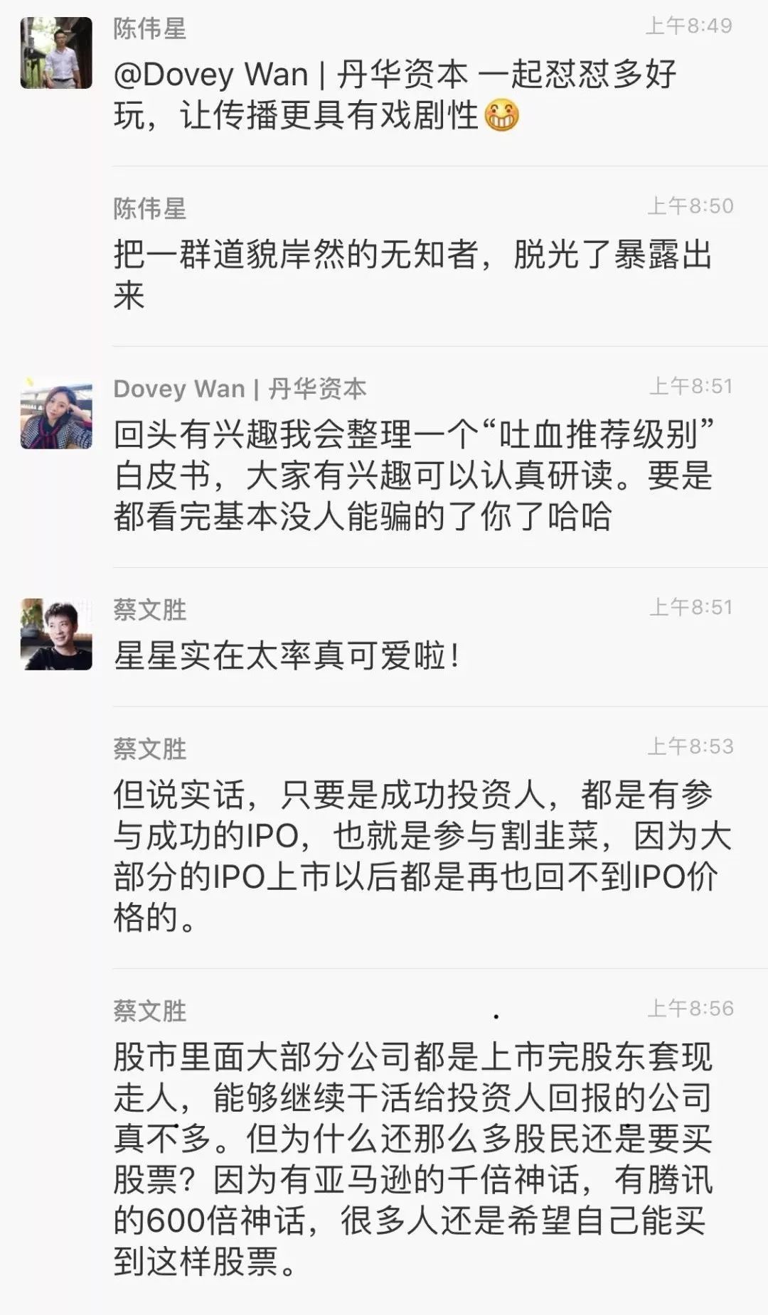这种说法立马引起了在3点钟无眠区块链群(以下简称3点钟无眠群)中的陈伟星的反驳。作为这个500人微信群的意见领袖之一,陈伟星反问,股权投资的割韭菜方法比币圈高级吗?整个区块链行业的泡沫有全球股市泡沫高吗?朱啸虎则回应称,ICO这种考验人性的模式从来没有成功。