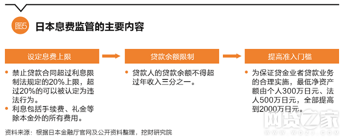 高息费问题在日本由来已久,1954年《出资法》和《利率限制法》颁布之前的年利率一度高达182.5%以上,后经5次调整缓慢下降,1999注册的合法贷金业者放贷利率仍高达40%。2000年6月日本监管部门修改出台了《出资法》,重点强化了对现金贷的监管,其主要内容包括(图5):
