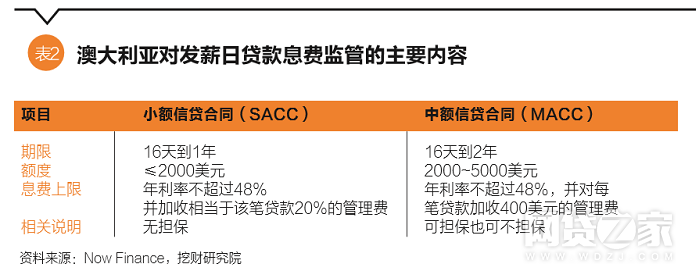 一是设定贷款利率上限。按照期限的不同澳大利亚将发薪日贷款分为小额信贷合同(SACC)和中额信贷合同(MACC)两种(表2)。明确发薪日贷款服务费不得超过本金的20%,月利率不能超过4%。如果借款人为了另外一笔小额贷款而贷款,则禁止再收取服务费。如果发生贷款逾期,费用收入总共不能超过借款数额的2倍,但该费用不包括强制执行费。需要说明的是,除了小额信贷合同和中额信贷合同外,澳大利亚严格禁止贷款人从事期限短于15天、金额少于2000美元的短期借贷合同(short-term credit contract,STCC),否则会被处以民事罚款或追究刑事责任。