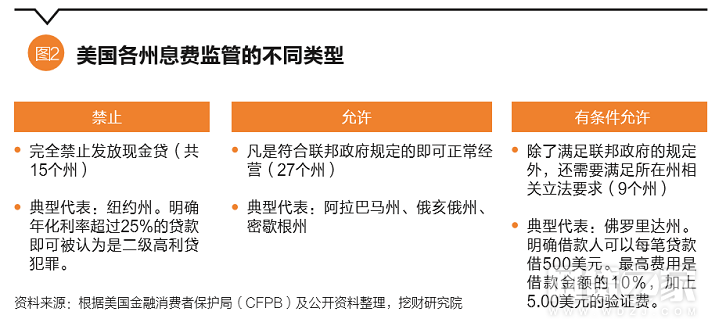 一是实行息费统一监管。美国联邦立法明确要求向军人及其亲属发放的消费贷款年利率不得超过36%。在随后出台的《反欺诈腐败组织法案》中进一步明确,如果利率超过各州规定的法定最高利率的两倍都构成放高利贷罪;而判定一笔借贷利率是否超过法定最高利率,需要将放贷人收取的各项费用如管理费、手续费等计入利息。由于反高利贷法属于州法律,各州自己规定法定最高利率,导致美国各州的法定最高利率差别很大。由于对于是否设置普遍的贷款利率管制一直存在着广泛的争议,美国国会也禁止美国金融消费者保护局(Consumer Financial Protection Bureau,CFPB)利用联邦法规直接设置利率上限,因此CFPB不得不寻求其他方法改变贷款行为。2016年6月CFPB曾建议允许出借人提供两种长期贷款方案:一种是贷款期限不超过2年,且年化利率不超过36%的贷款,违约率控制在5%之内;另一种则是年化利率上限为28%,申请费用不能超过20美元的贷款。而在限制最高利率的各州立法中,对最高利率的限制通常取决于贷款用途、贷款种类、放贷人的种类等。最高利率通常是一个固定利率,也可能被设定为取决于某些指数的浮动利率。