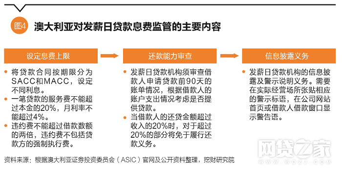2013—2014年发薪日贷款在澳大利亚大约占到全国消费信贷市场的0.4%,整个市场交易额达到4亿美元。但贷款息费折算下来的年化利率在48%~1500%不等,促使监管部门采取日益严格的监管措施。自2008年开始,澳大利亚各州和地区将消费信贷领域的立法权统一上交给联邦政府,相关监管部门重点加强了对发薪日贷款市场的监管。其内容主要包括(图4):