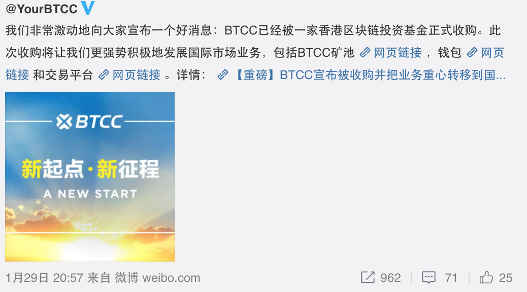 1月29日,比特币中国官方微博和公众号同时发布消息,宣布被香港区块链投资基金收购:“BTCC作为全球运营历史悠久的比特币交易平台,今日正式宣布被香港区块链投资基金收购。”被收购后, BTCC表示进行业务调整,把业务重心完全转移到,BTCC矿池、Mobi数字资产钱包和美元现货交易平台。