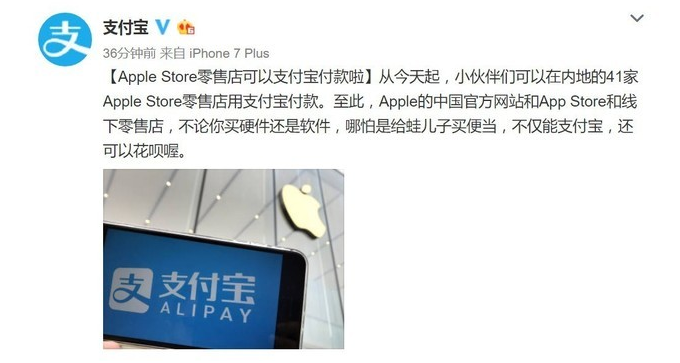 2月7日,支付宝官方宣布,从即日起,内地的41家苹果AppleSTOre线下零售店将支持支付宝付款。今后无论是在苹果线下零售店买硬件,还是在AppStore买软件,都可以用支付宝付款,还可以用花呗。