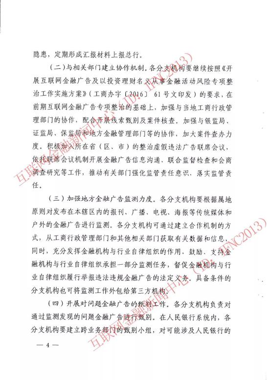 央行要求,各地要继续按照《开展互联网金融广告及以投资理财名义从事金融活动风险专项整治工作实施方案》(工商办字(2016)61号文印发)的要求,在前期互联网金融广告专项整治的基础上,加强与当地工商行政管理部门的协作,配合开展线索甄别及案件核查。加强与银监局、证监局、保监局和地方金融管理部门等的协作,加大案件查办力度。