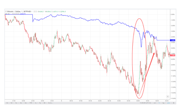 还有一种对数字货币的信心,来自周一的市场表现,认为股市大跌后资产轮动会为数字货币带来机会。在周二数字货币继续肆意屠杀之前,周一,道指在收盘前一小时加速下挫的时候,比特币却急速拉升,和道指出现了明显的走势分化。