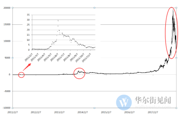 与这一轮幅度相当的下跌,比特币在历史上曾经历过两次,一次在2011年,一次在2013年。
