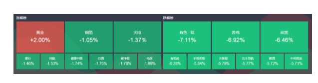 板块中,据选股宝主题库的数据,有色、养鸡等板块领跌,受全球避险情绪高涨影响,仅有黄金板块上涨。