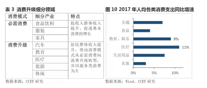 随着居民整体收入提高,消费升级势在必然,2017年,汽车、教育、医疗、旅游、休闲这五大类消费均呈现高速增长。在全国居民消费支出中,医疗保健支出以11%的同比增速位居首位,但仍然供不应求。目前,每千名老年人只拥有养老床位不足35张,教育的短缺情形类似于医疗。高端服务业的供给增长目前难以满足居民的需求,因此,衣食住行相关的居民消费将随着供给的质和量提升而稳定增长。