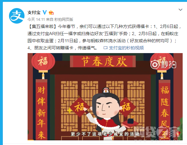 网络整理 2021-03-22 17:56网贷之家讯 2月5日,支付宝官微发布消息称,今年继续集五福给用户发红包,集五福时间为从2月6日零点开始截止2月15日零点,除夕晚22点18分开奖,可以通过四种方式获得福卡。