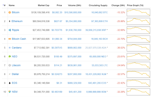 Coinmarketcap网站数据显示,在过去24小时内,比特币跌幅为15.3%。除了比特币以外,其他数字货币也继续大幅下滑,以太币、瑞波币等市值前十的数字货币较24小时前跌幅均超过20%。