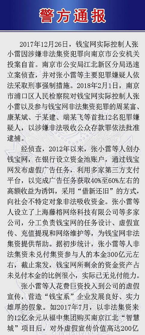 网络整理 2021-03-22 17:56网贷之家综合 2月2日早间,江苏省南京市公安局官方微博@平安南京 披露了钱宝网涉嫌非法集资案件的详细案情。