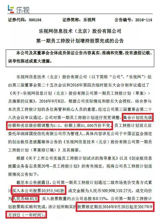 自己掏了2.55亿,借款2.55亿的这一员工持股计划在2016年9月买入了1095.35万股的乐视网,成交均价为46.61元。该计划所购买的股票锁定期自2016年9月20日起至2017年9月19日(一年时间)。