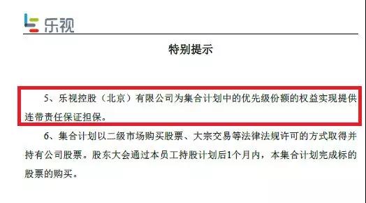 值得注意的是,这一员工持股计划还有担保方,乐视网公告显示,乐视控股(北京)有限公司为集合计划中的优先级份额的权益实现提供连带责任保证担保。
