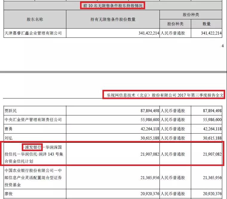 乐视网季报、年报、半年报中的流通股东信息显示,华润·润泽143号集合资金信托计划的前面有浦发银行的名字。