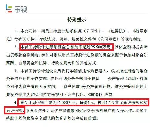 对于这一计划的杠杆比例,乐视网员工持股计划也有明确公告。本员工持股计划筹集资金总额不超过2.55亿元,集合计划份额上限为5.1亿份,每份1元,按照1:1设立优先级份额和劣后级份额。本员工持股计划筹集资金全额认购集合计划的劣后级份额。