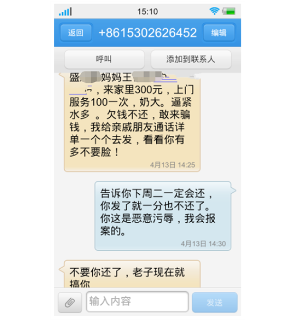 多名投诉人提供的催收短信截图显示,一信贷甚至使用淫秽图片,与借款人身份证信息一起,发送给借款人通讯录好友。