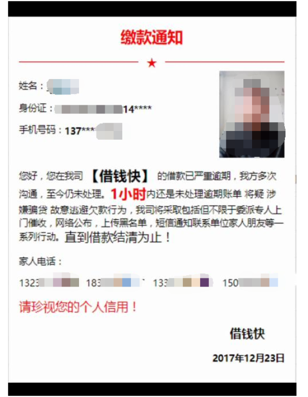 大量投诉人称,借钱快将其姓名、身份证号、电话、照片等信息发送给其通讯录好友。还有多名投诉人称,自己的借款并未到期,就遭到借钱快此类催收威胁,要求其提前还款。