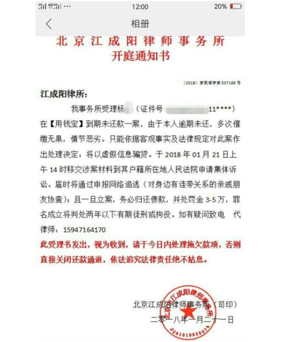 1月25日,用钱宝回应聚投诉承认:一家第三方催收公司的个别员工,私自向长期逾期用户发送虚假律师函。当日,已对其终止合作。1月29日,用钱宝再次回复:已要求所有第三方催收杜绝此类行为,并已与衢州仲裁委开展批量互联网仲裁,由仲裁委直接向逾期借款人发送通知及函件。