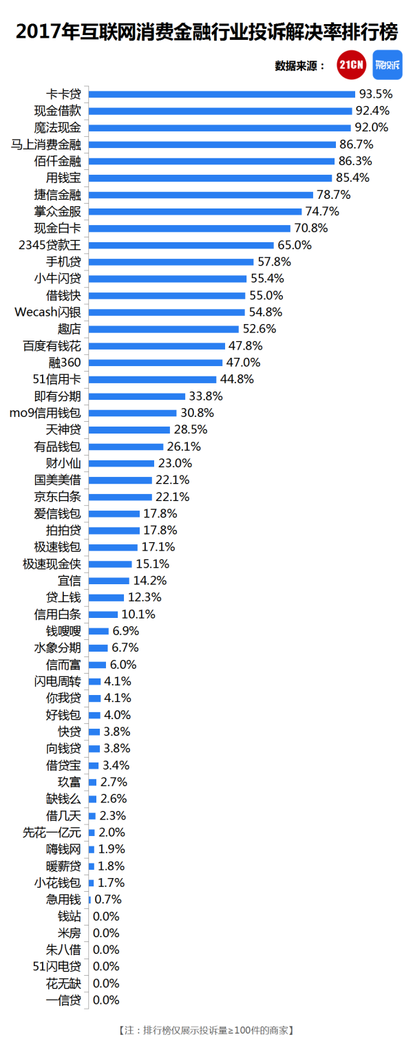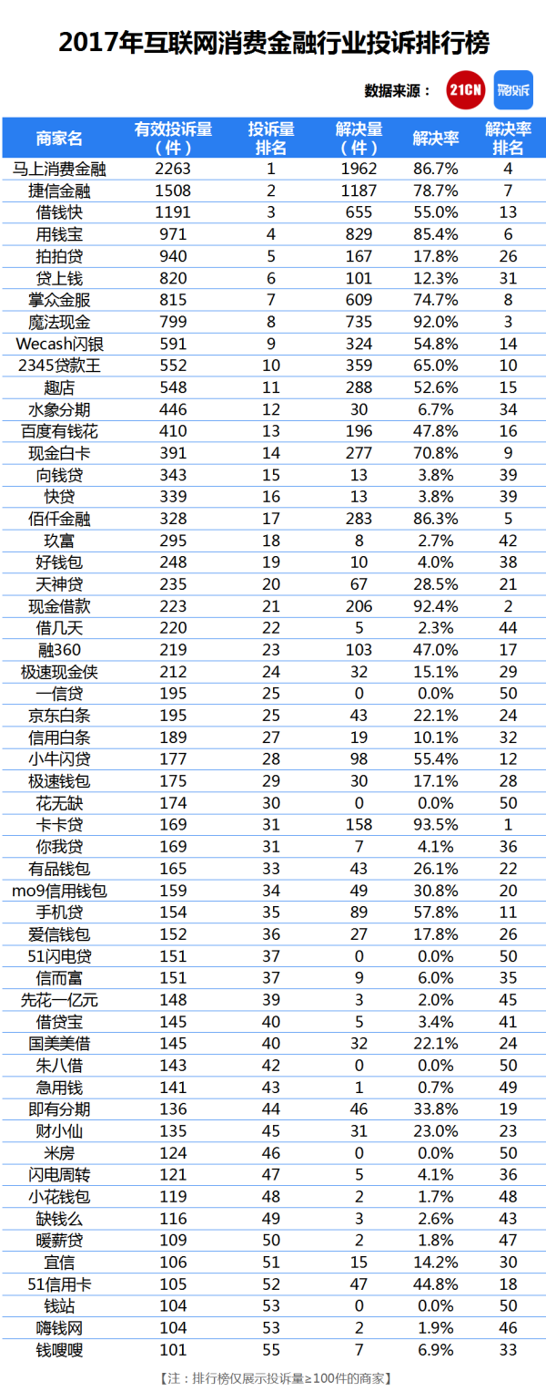 2017年,21CN聚投诉共受理全国关于互联网消费金融行业的有效投诉约26600件,其中9914件获反馈解决,投诉解决率约37.3%。目前已统计386个商家的投诉数据。