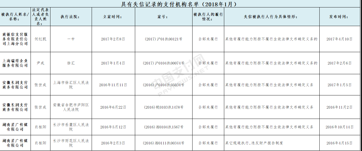 值得一提的是,另外3家此前上榜“老赖”名单的上海瑞得企业服务有限公司、安徽长润支付商务有限公司、湖南潇湘支付有限公司(原湖南星广传媒有限公司)由于仍未执行生效法律文书,依然还是“老赖”。