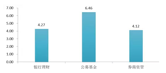 截至2017年12月,银行发行的净值型理财产品平均年化收益率为4.27%;公募基金产品年化收益率为6.46%;券商资管型产品年化收益率为4.12%。