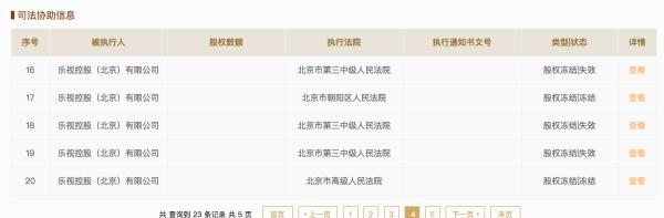 国家企业信用信息公示系统网站显示,乐视影业共有23条股权冻结信息,被执行人均为乐视控股。值得一提的是,一些股权冻结已处于失效状态。