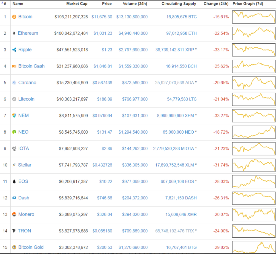其他虚拟货币今日亦全线暴跌,以太币、瑞波币、比特币现金等大市值币种跌幅均逾20%。