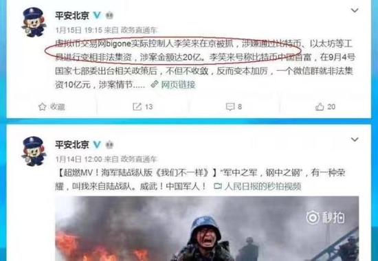 网传截图显示该信息来自平安北京,截图信息称,李笑来涉嫌通过比特币、以太坊等工具进行变相非法集资,涉案金额达20亿元。新浪科技查询平安北京微博,未见该条微博内容。