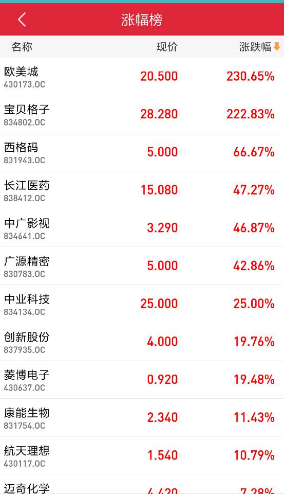 9点30分,新三板进行了首次撮合,共有16只股票成交。在第一次撮合中,共有9只股票上涨,因为竞价首日不设涨跌幅限制,欧美城(430173.OC)的涨幅达到了230.65%,最新成交价为20.5元/股。此外,宝贝格子(834802.OC)的涨幅也达到222.83%,最新成交价为28.28元/股。跌幅方面,共有5只股票出现下跌,其中时光科技(833857.OC)和长江绿海(833382.OC)跌幅都超过50%。