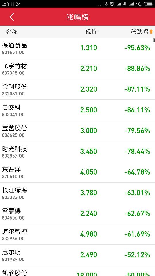 在跌幅方面,飞宇新竹(837348.OC)、金利股份(832081.OC)、宝艺股份(832625.OC)、时光科技(833857.OC)在第二次撮合时冲到跌幅榜前列,跌幅均在80%左右。