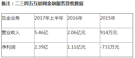 相较于2017年才转换跑道切入互金业务的A股公司,二三四五凭借互联网出身的基因优势,早于2014年互金业务刚刚方兴时即开辟了业务第二战场——平台网贷。2014年8月,二三四五贷款王平台上线(早期平台名称为“随心贷”),平台公司载体为“上海二三四五金融科技有限公司”。数据显示,2015年互金业务实现销售收入913万元,利润-731万元。2016年,互联网金融服务实现销售收入2.06亿元,净利润1.11亿元。
