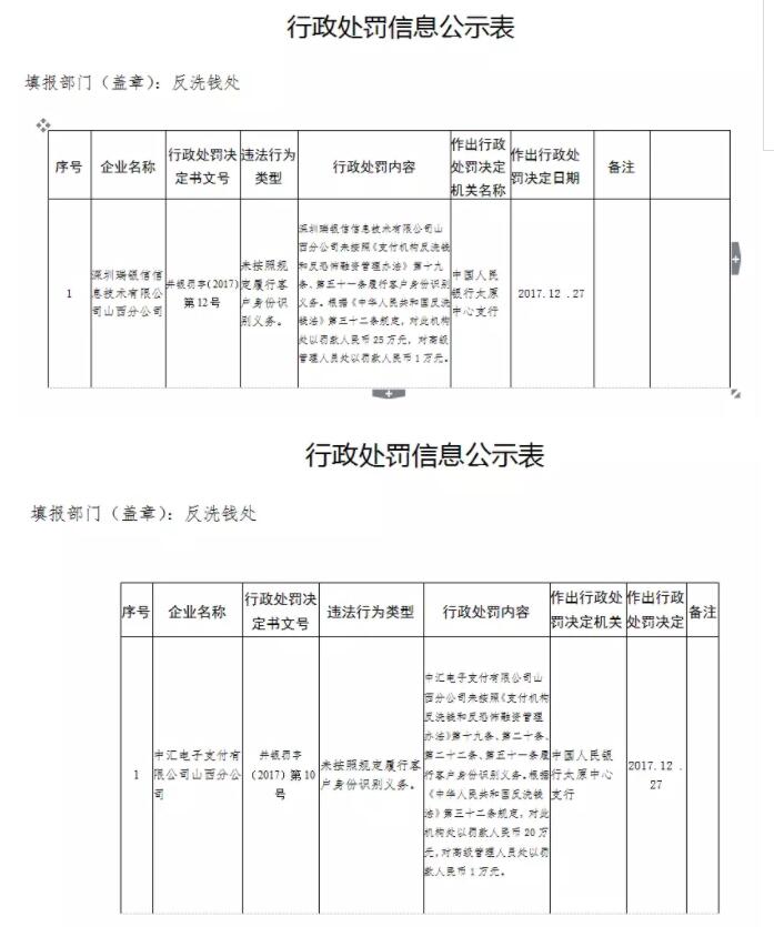 网络整理 2021-03-22 18:171月8日,中国人民银行太原中心支行开出7张罚单。凤凰网WEMONEY注意到,中汇电子支付有限公司山西分公司(下称“中汇支付”)以及深圳瑞银信信息技术有限公司山西分公司(下称“瑞银信”)分别被罚20万元、25万元。作出处罚的决定日期为2017年12月27日。