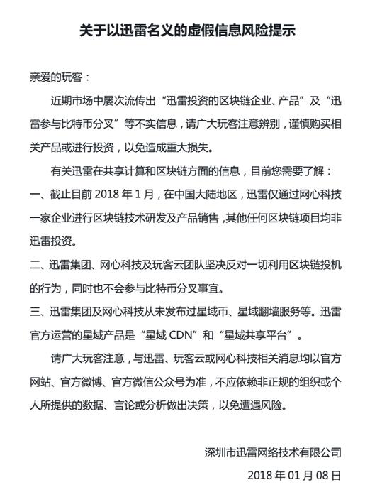 转载请标注:信息网——参与比特币分叉?迅雷:纯属造谣 坚决反对投机