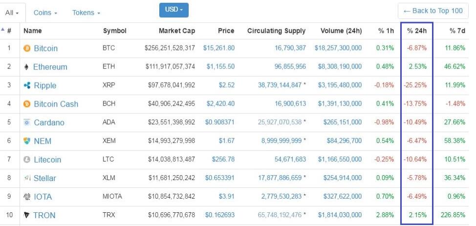 截至最近一次更新,比特币回到15000美元上方,十大数字货币之中,以太币和波场币(TRON)抹平24小时内跌幅转涨,均累涨逾2%,其余数字货币24小时内跌幅也明显收窄,比特币跌幅不足7%,瑞波币跌幅仍然最大,超过25%。