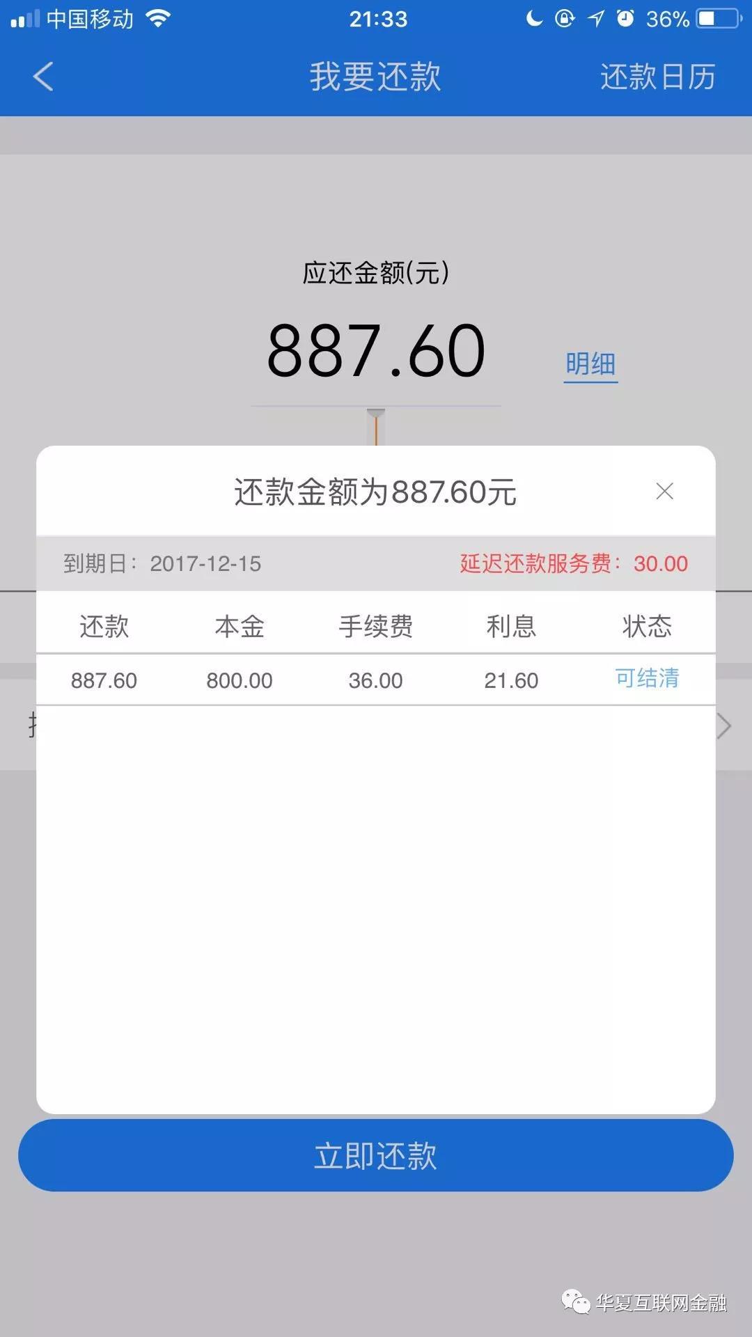 但是因为逾期未还现在总共要还887.6元,其中延迟还款服务费30云,利息21.6元,手续费36元。
