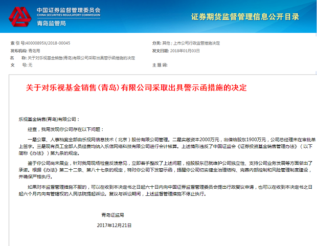关于对乐视基金销售(青岛)有限公司采取出具警示函措施的决定