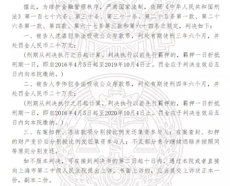 一、被告人沈嘉犯非法吸收公众存款罪,判处有期徒刑三年六个月,并处罚金人民币二十万元;