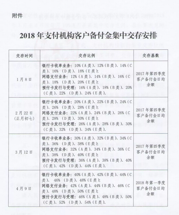 就在2017年最后一个工作日,央行又发布《中国人民银行办公厅关于调整支付机构客户备付金集中交存比例的通知》,将支付机构的客户备付金存管交存比例,从目前的平均20%上调至50%左右。2018年1月仍执行现行集中交存比例20%,2月至4月按每月10%逐月提高,至2018年4月才将集中交存比例调整到50%左右。