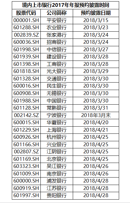 根据预约披露时间,今年两市首份上市银行年报披露将于3月15日登场。和往年一样,今年在上市银行业绩报告披露中“打头阵”的仍是平安银行。随后,农业银行、张家港农村商业银行、招商银行、中信银行、建设银行、工商银行、光大银行、交通银行、民生银行、无锡银行、中国银行、常熟银行以及宁波银行等13家银行也将在3月陆续披露年报。