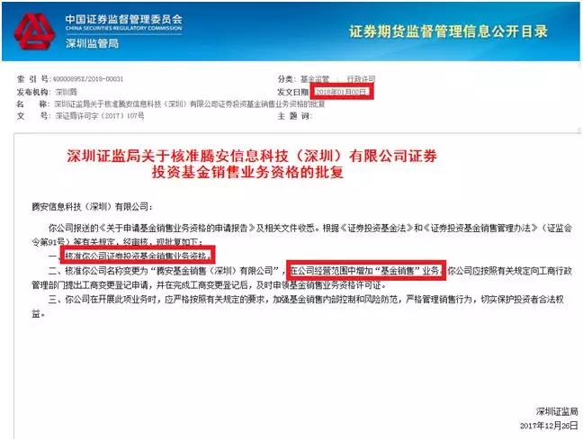 2018年1月2日,深圳证监局发布关于核准腾安信息科技(深圳)有限公司证券投资基金销售业务资格的批复,有三条内容,第一条是核准腾安科技证券投资基金销售业务资格。