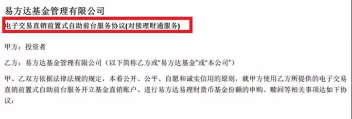 例如,在腾讯理财通或微信平台进入理财通购买货币基金易理财,网站购买中显示出详细的购买合同是基金公司的电子直销前置式自主前台服务协议(对接理财通服务)。