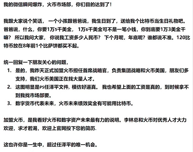 火币网新任高管工资以比特币结算?真相是…