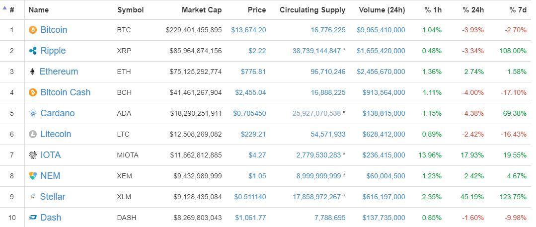 CoinMarketCap数据显示,全球市值排名前十的数字货币在过去24小时之内涨跌不一,但在新年首日下跌的居多,伴随亚洲市场进入1月2日而反弹上扬。