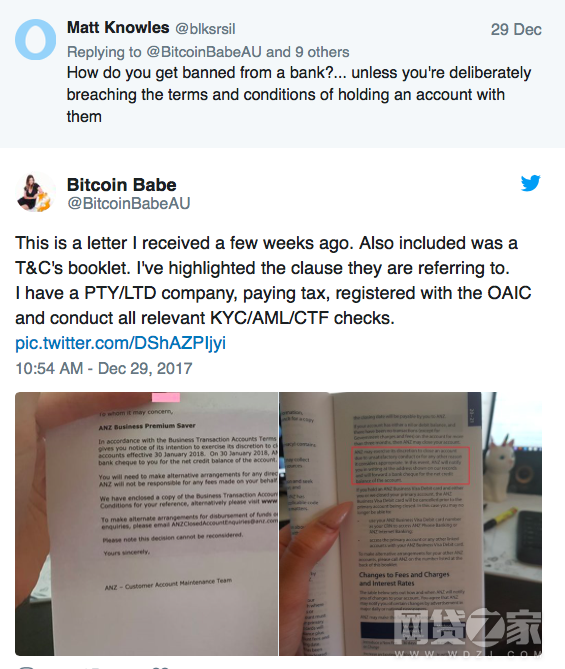 一个名叫MichaelaJuric,在推特上被称为BitcoinBabe的用户说,有30家银行关闭了他的账户,并张贴了澳新银行的来信照片,该行称将根据其条款在2018年1月30日生效冻结账户。