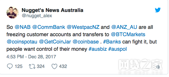 据《悉尼先驱晨报》报道,加密货币交易员,Youtube知名播主AlexSaunders在推特上发文称,澳大利亚国民银行,澳新银行,澳大利亚联邦银行和Westpac银行,冻结客户账户并禁止向比特币交易所CinJar,CoinSpot,CoiNBAse和BTCMarkets转账。