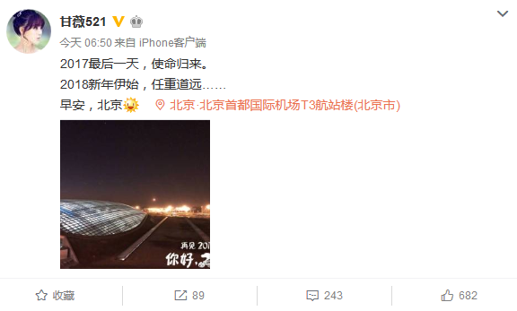 网络整理 2021-03-22 18:26贾跃亭妻子甘薇12月31日早间发布微博,写道“2017最后一天,使命归来。2018新年伊始,任重道远……”,定位北京首都国际机场T3航站楼,表示其本人已经回国。并在回复网友评论时表示,会妥善处理好乐视网问题。