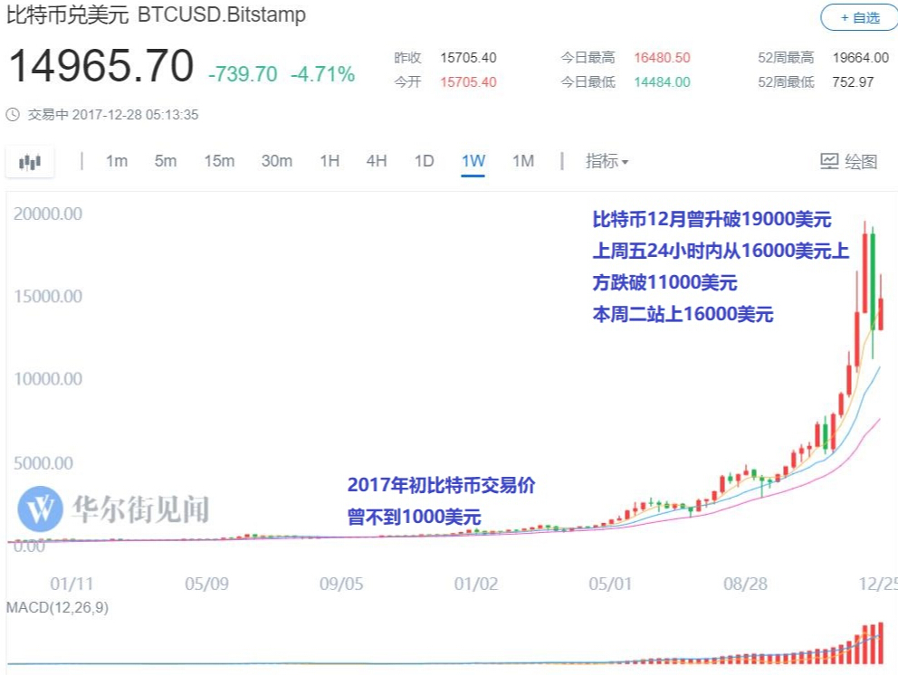 交易平台Bitstamp数据显示,今年年初比特币交易价曾不到1000美元,10月末也才站上6000美元,到了本月一度升破19000美元。惊人的涨幅同样伴随着惊人的震荡。在Colas发布上述预测以前,比特币刚刚经历了一轮暴跌和反弹。