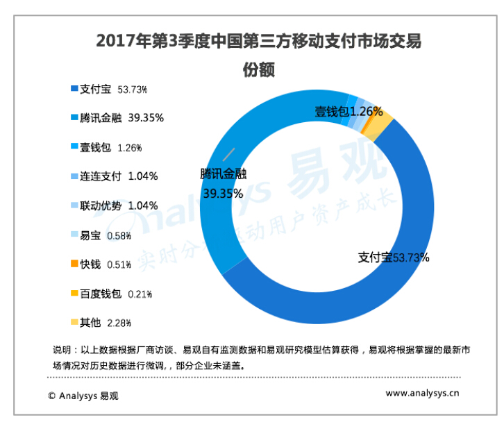 2017年第3季度,移动支付市场市场份额前列包括支付宝、腾讯金融、壹钱包、连连支付、联动优势、易宝、快钱、百度钱包。其中支付宝占比53.73%,腾讯金融占比39.33%。